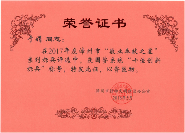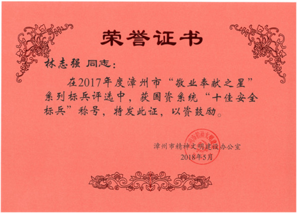 公司3名员工荣获2017年度漳州市敬业奉献之星——国资系统“十佳国资标兵”