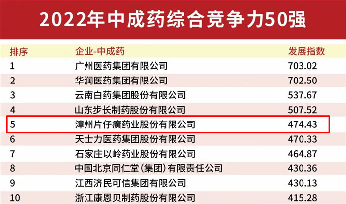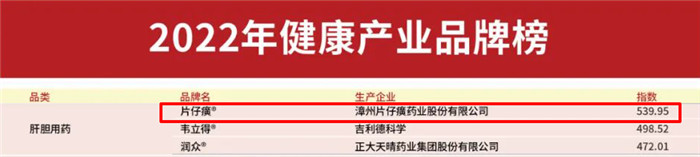 112日晚,在荣耀之巅·与你比肩”——2022西普金奖颁奖盛典上,片仔癀凭借突出的疗效、杰出的市场表现,以539.95指数连续八年荣登肝胆用药类品牌价值首位。复方片仔癀含片荣登2021-2022健康中国品牌榜锐榜。2022年健康产业品牌价值榜中,片仔癀名列第四名;片仔癀药业名列2021-2022年医药工业综合竞争力指数·中成药指数TOP50企业第五,2021-2022年医药工业综合竞争力指数TOP100企业前列。