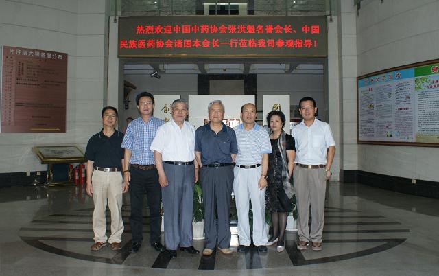 中国中药协会名誉会长张洪魁(左三)、中国民族医药协会会长诸国本(左四)与我司董事长冯忠铭(右三)、总经理潘杰(左二)等相关领导合影。
