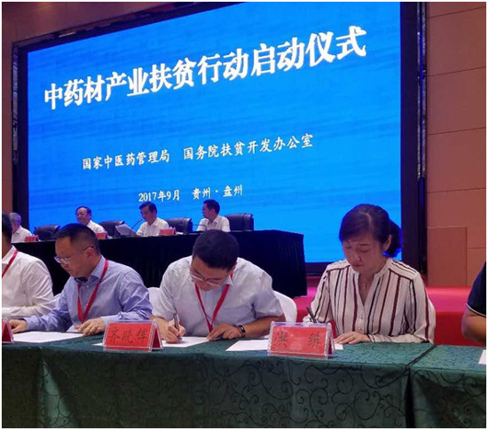 2017年9月1日,全国中药材产业扶贫行动启动仪式在贵州省盘州市隆重举行,国家卫生计生委副主任、国家中医药管理局局长王国强、国务院扶贫开发领导小组副组长、国务院扶贫办主任刘永富等领导出席会议,人民日报、新华社、经济参考报、中国中医药报等媒体跟进报道。我司作为中药行业重要代表应邀参加会议,并与中国林麝之乡——陕西凤县就推进中药产业扶贫,助力精准扶贫脱贫达成合作意向,主要通过构建“中药企业+专业合作社+农户”的利益联结机制,带动贫困户脱贫致富。