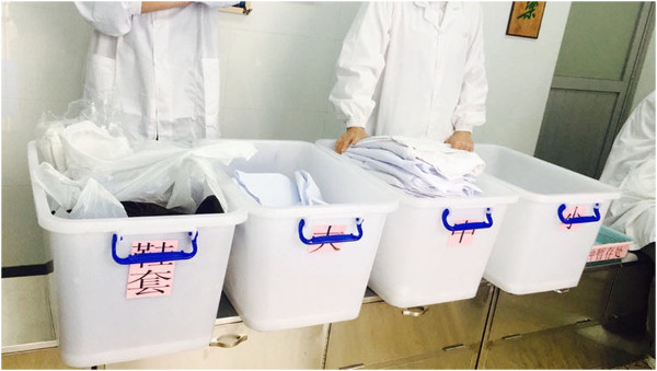 ▲第二车间:鞋套、工作服按规格大小整理收纳