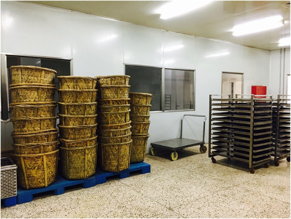 ▲饮片车间:药材筐叠放地板架上,整齐有序