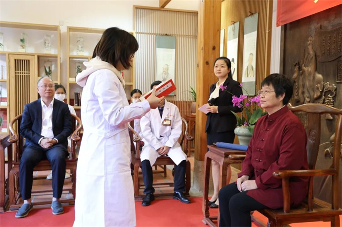 来自诏安县太平镇卫生院、漳州市龙文区碧湖街道社区卫生服务中心、漳州高新技术产业开发区颜厝卫生院的三位青年医师呈拜师帖、行拜师礼、敬茶献花,每一个环节庄重而充满仪式感,每一个动作都饱含着对师父的敬重,更透露出献身中医药事业的坚定决心。