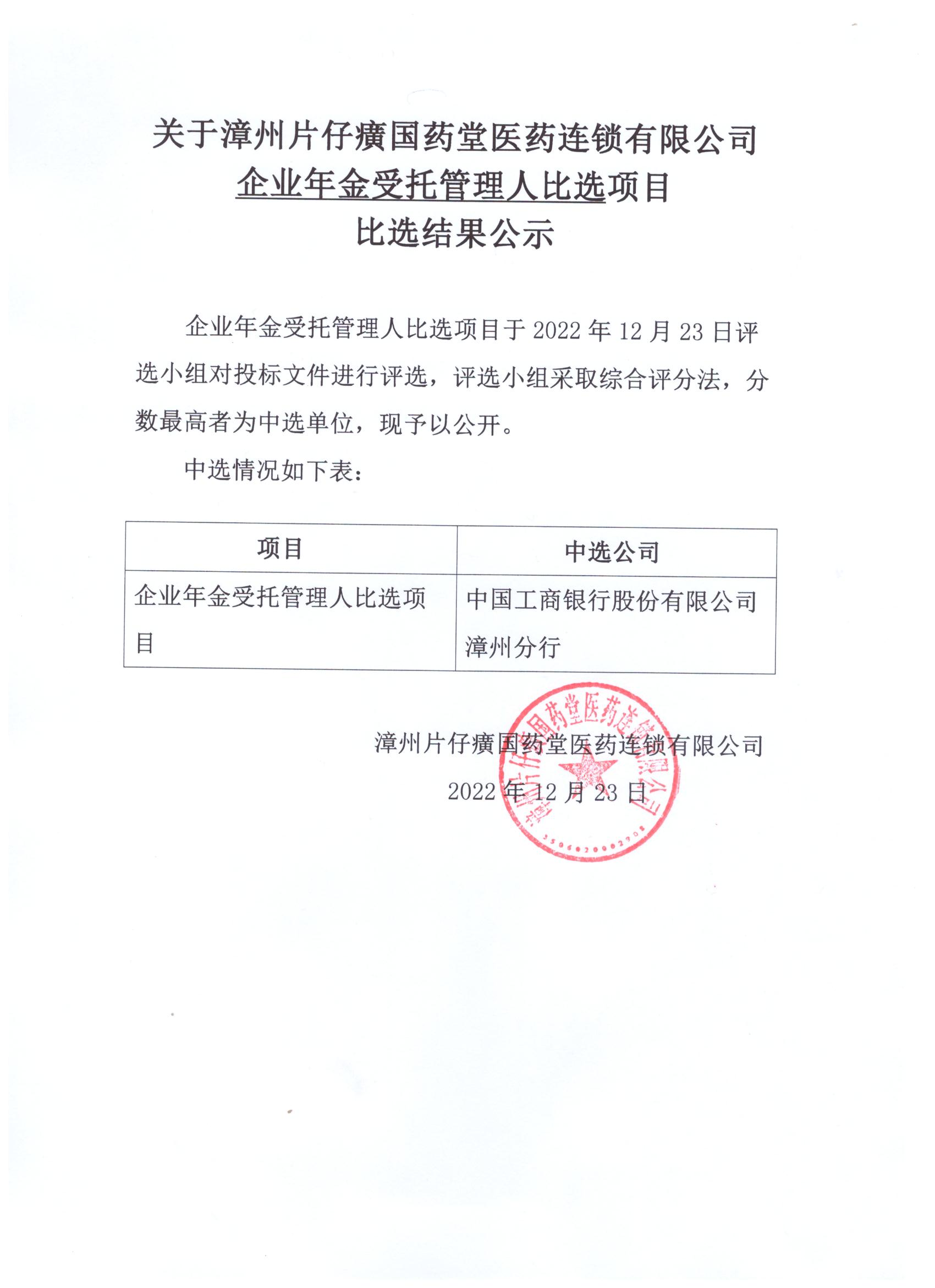 关于漳州片仔癀国药堂医药连锁有限公司企业年金受托管理人比选项目比选结果公示