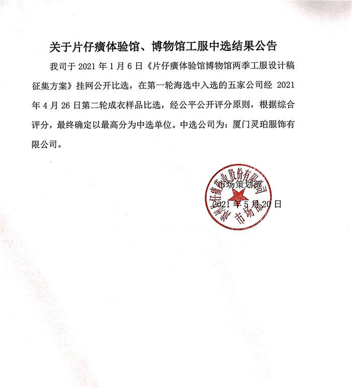 关于片仔癀体验馆、博物馆工服中选结果公告