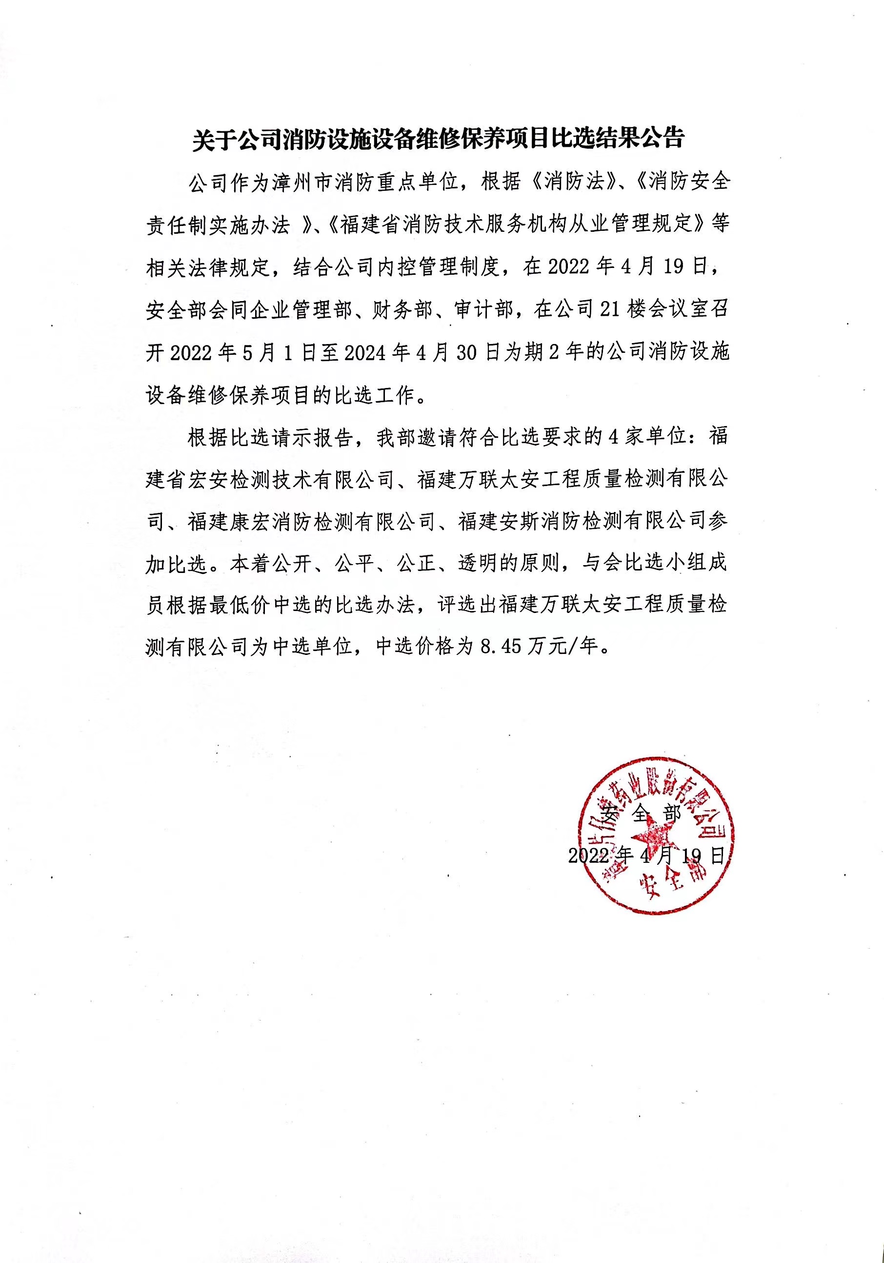 公司消防设施设备维修保养项目比选结果