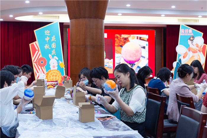 随后,现场工作人员向大家介绍了手工制作花灯的流程,将材料包分发后带领职工共同完成花灯的制作,现场有用颜料绘画出创意的月球灯,也有耐心组装精致的传统花灯,每一个花灯都拥有其独特的寓意,大家开发了动手能力和想象力,结合时代潮流体会到了浓浓的中国情。