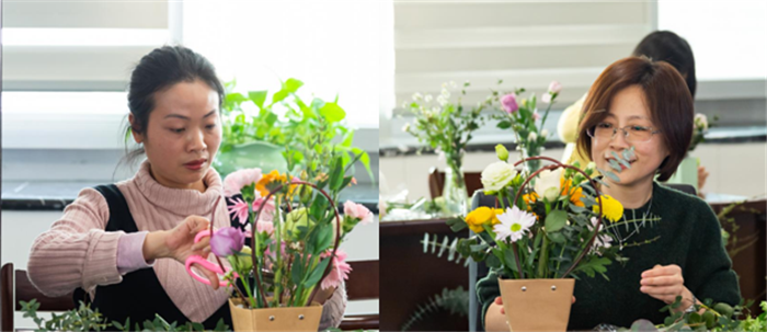 插花活动现场,工作人员整齐摆放着鲜花、花篮和剪刀,仪式感满满;一朵朵鲜花通过大家巧手的裁剪,插出一篮蓝造型错落有致、创意十足的作品,成就感满满。合影中,女同胞们手捧花篮,笑容甜美,气氛温馨且浪漫。