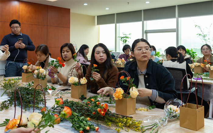 本次活动特邀专业的花艺老师为大家进行讲解和指导。活动伊始,老师向大家详细讲解了插花的基本技巧、花材的选择与搭配,并向大家介绍各种花卉所蕴含的花语和祝福。在老师的讲解下,大家纷纷参与到插花创作中,对鲜花进行筛选、修剪,通过自己的创意将一支支鲜花变成一篮篮艺术品,近距离体验插花艺术的魅力。同时,公司党委还为每位女性干部职工准备了一份花礼,表达公司对女性职工的关怀与祝福。