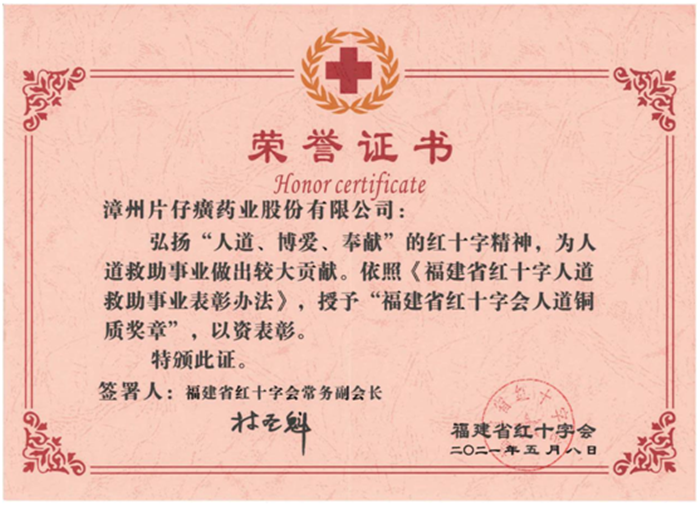 5月7日,漳州市红十字会召开第六届理事会第三次会议暨全市红十字会系统改革推进会,并向荣获红十字会系统表彰的先进单位和个人代表颁发证章及奖牌,公司荣获2020 年度福建省红十字人道铜质奖章。多年来,公司始终不忘弘扬“人道、博爱、奉献”的红十字精神,将社会责任扛在肩上,落实到行动上,每年拨出专项资金用于扶贫济困。积极参与国家新冠疫情防控,前后投入近亿元,并被国家科技部推荐为全国科技系统抗击新冠肺炎疫情先进集体,受到社会各界的高度肯定。