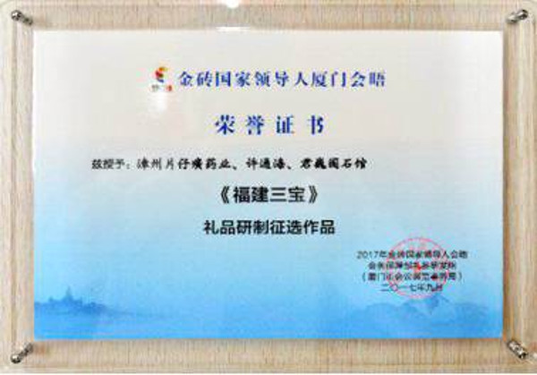 漳州片仔癀药业、许通海、君巍国石馆合作研制的《福建三宝》礼盒荣获厦门金砖国家领导人会晤国礼征选作品团队奖。片仔癀继1972年中日建交被当作“国礼”后,多次走出国门,向世界各国人民展示了中医药文化及“福建三宝”的独特魅力。