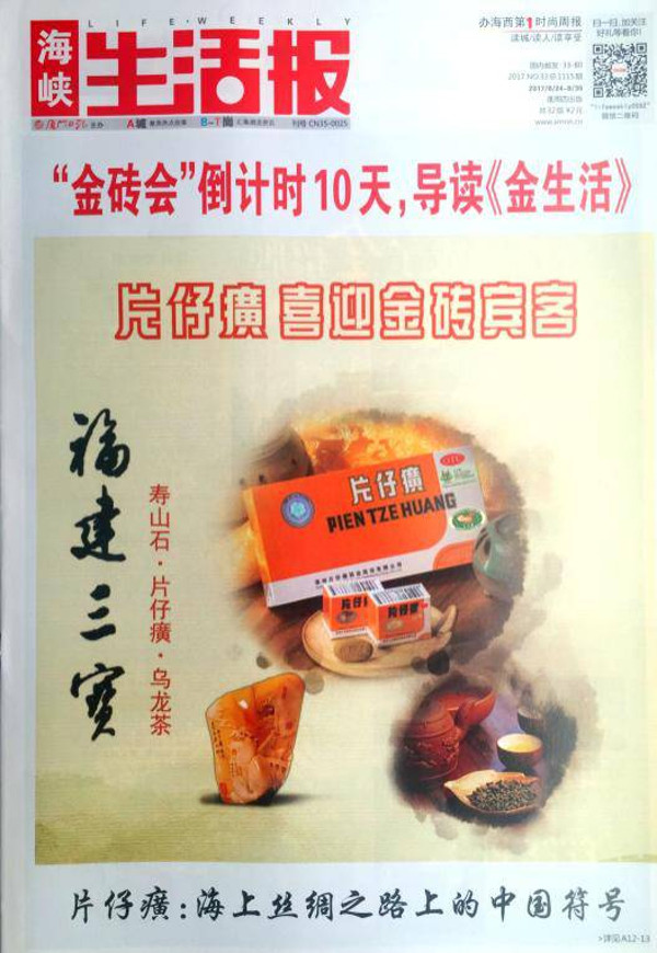 1. 8月24日至8月30日,《厦门海峡生活报》刊登“福建三宝”片仔癀喜迎金砖宾客特刊。