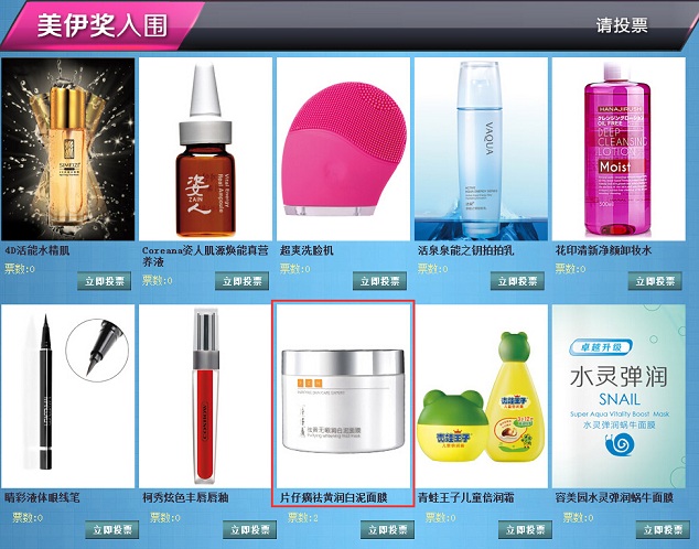 第二步:选择【美伊奖入围】中的“片仔癀祛黄润白泥面膜”,点击右下角立即投票(见下图)