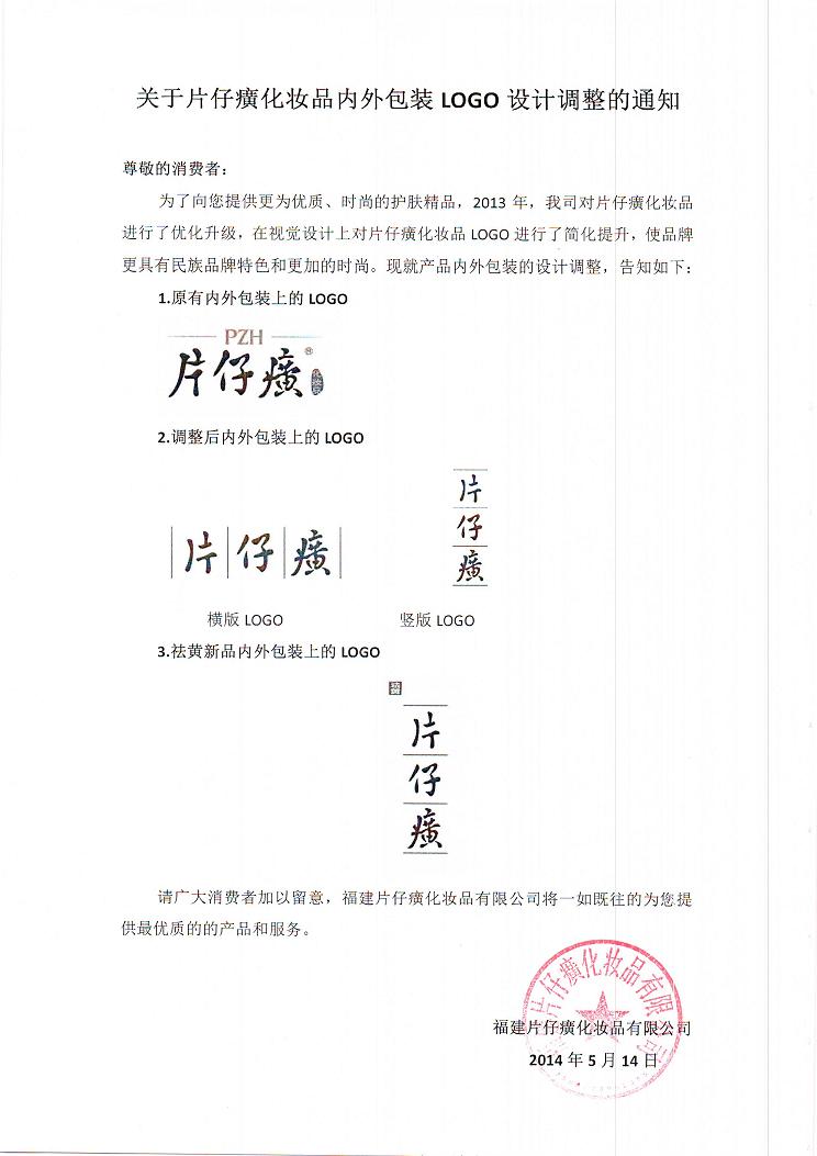 关于片仔癀化妆品内外包装LOGO设计调整的通知