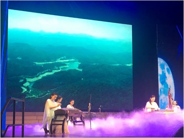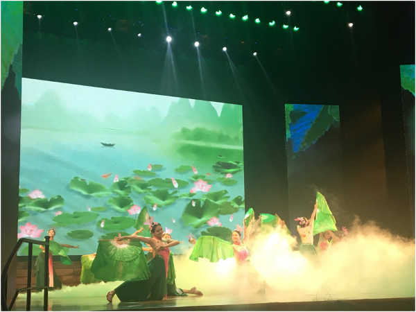 晚会在欢快的开场舞《盛世欢歌》中拉开了序幕。紧接着的潮音锣鼓《龙腾虎跃》,气势磅礴、动人心魄;少儿舞蹈《我爱北京天安门》,充满青春的朝气,抒发了对祖国的热爱之情;歌伴舞《西湖·美从天上来》,展示了漳州“田园都市、生态之城”的风韵和魅力;情景歌舞《月港故事》,讲述了月港这一明代著名外贸通商口岸的前世今生;龙人古琴《龙津琴韵》、茶艺民乐《奇兰飘香》让观众领略到漳州琴、茶文化的听觉与视觉的盛宴;男声小组唱《闽南人》,唱出了闽南儿女爱国爱乡、敢拼会赢的精神风貌;龙人古琴《龙津琴韵》、新编竹马戏《唐二带妻逛漳浦》、南音表演《百鸟归巢》、器乐舞蹈《高山畲水一家亲》等节目,精彩地呈现了漳州浓郁独特的地方舞台艺术;整场晚会充满了浓厚的漳州味和闽南风,赢得现场观众的阵阵掌声。最后,全场起立齐声《歌唱祖国》,将晚会气氛推向高潮。
